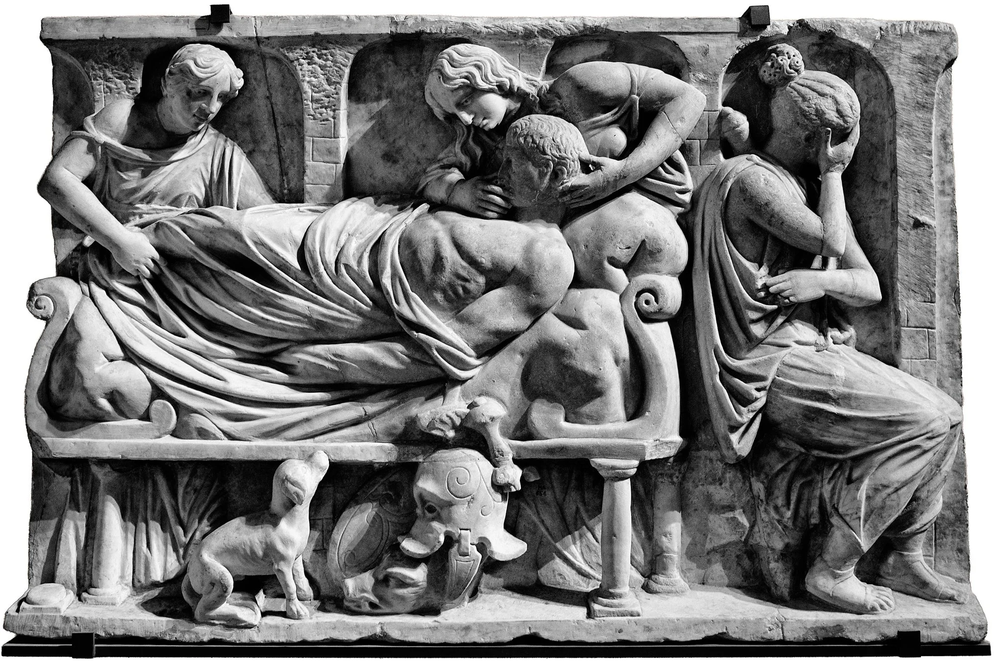 Meleager reclines on a couch, his body still strong but lifeless. Two women bend over him in grief — one supporting his shoulders, the other touching his face — while a third sits aside, her head veiled and her hand raised to her brow in a timeless gesture of sorrow. At the foot of the couch, a small dog waits faithfully beside a fallen helmet and shield, reminders of the hero’s warrior life. The figures are enclosed within deep niches, suggesting both an architectural setting and a tomb-like space.