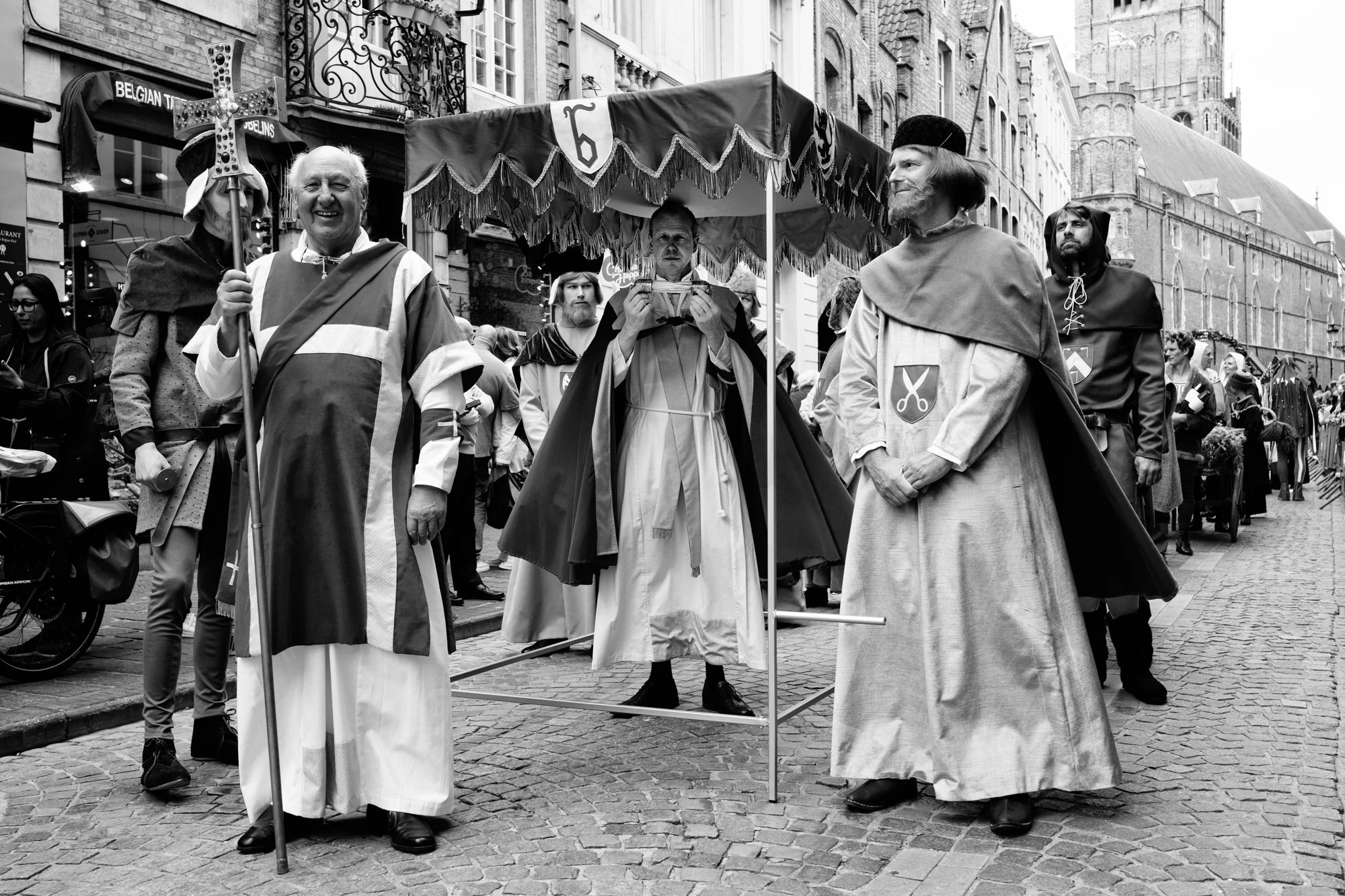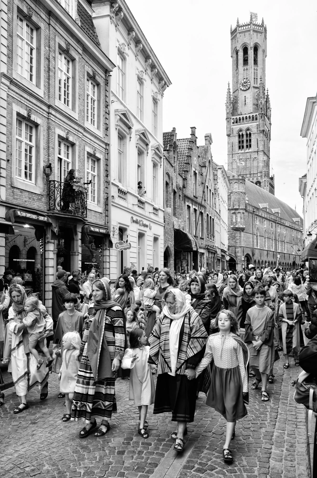 The procession in Bruges’ medieval streets during the annual Heilig Bloedprocessie, with the Belfry in the background.