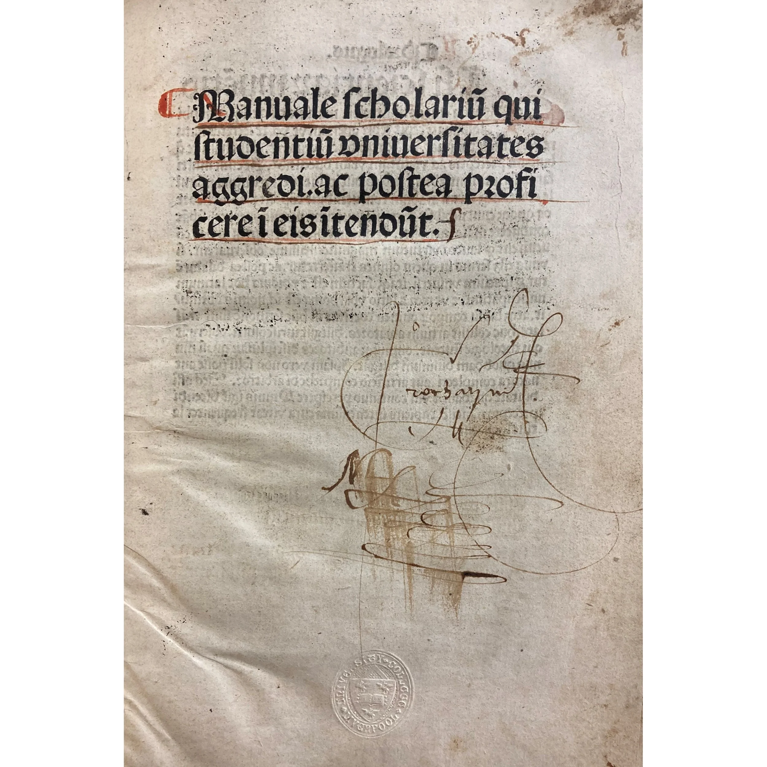 The title page of the Manuale Scholarium, a copy from 1492, printed in Deventer (The Netherlands).