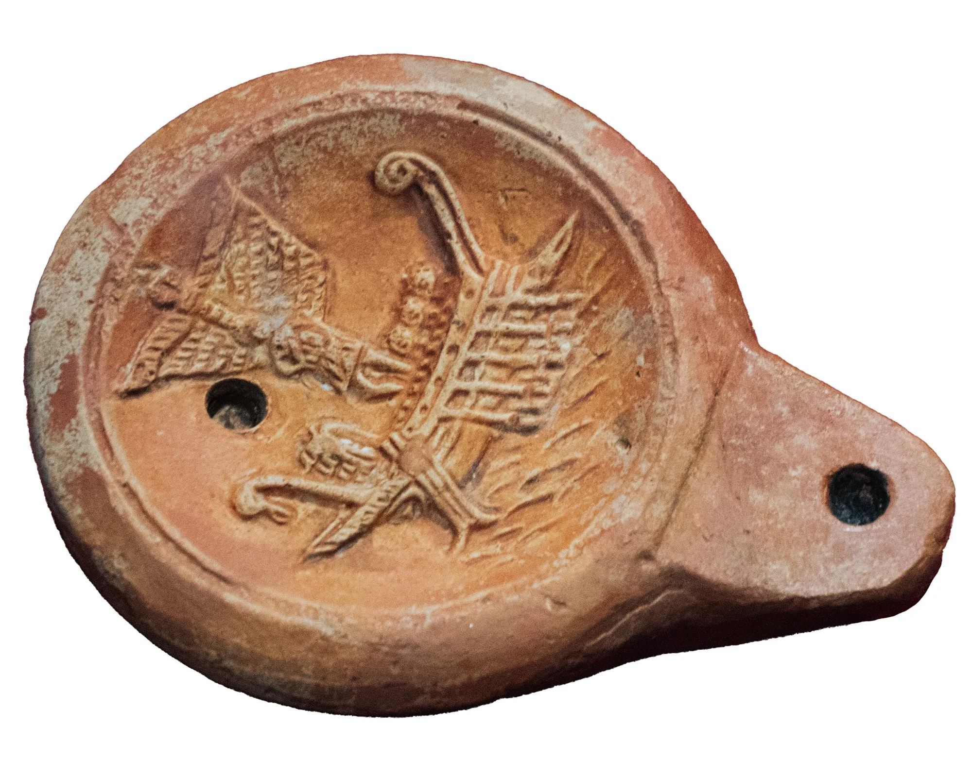 Terracotta oil lamp from the 1st century CE, depicting Odysseus tied to the mast of his ship. Found in Mérida, Spain, and now housed in the Museo Nacional de Arte Romano.