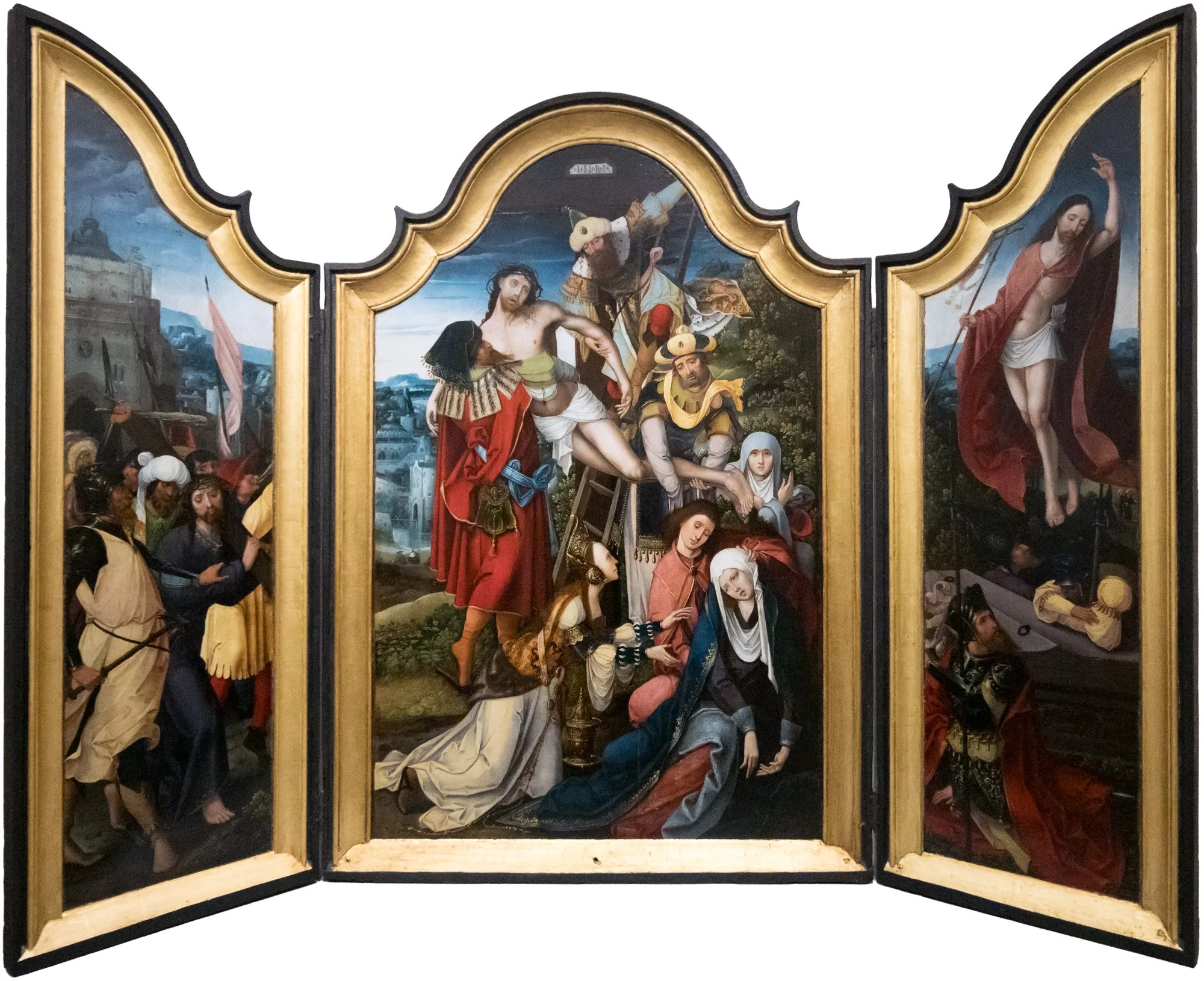The composition unfolds across three panels in a familiar but carefully calibrated sequence. On the left, Christ carries the cross, surrounded by a dense crowd that presses the drama into the viewer’s space. The central panel shows the Descent from the Cross: Christ’s lifeless body is lowered with solemn care, while Mary collapses in grief, her posture echoing that of her son. On the right, the Resurrection introduces a note of transcendence—Christ rises, serene and victorious, as the guards remain earthbound, asleep or bewildered.