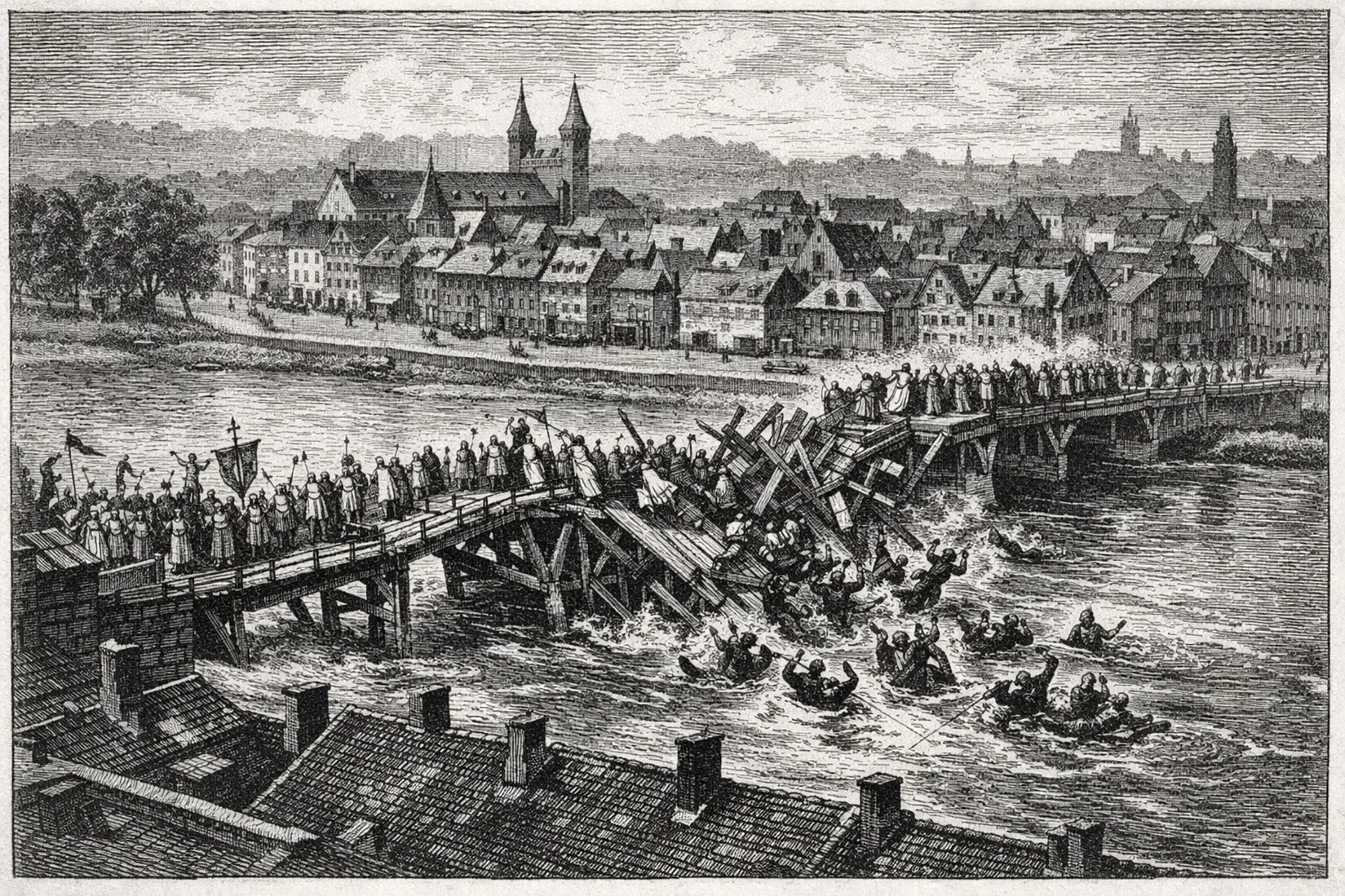 AI-generated impression of the disaster during the Heiligdomsvaart of 12 July 1275 in Maastricht. As thousands of pilgrims crossed the wooden bridge over the Maas, the central support gave way and the structure collapsed, throwing hundreds into the river.