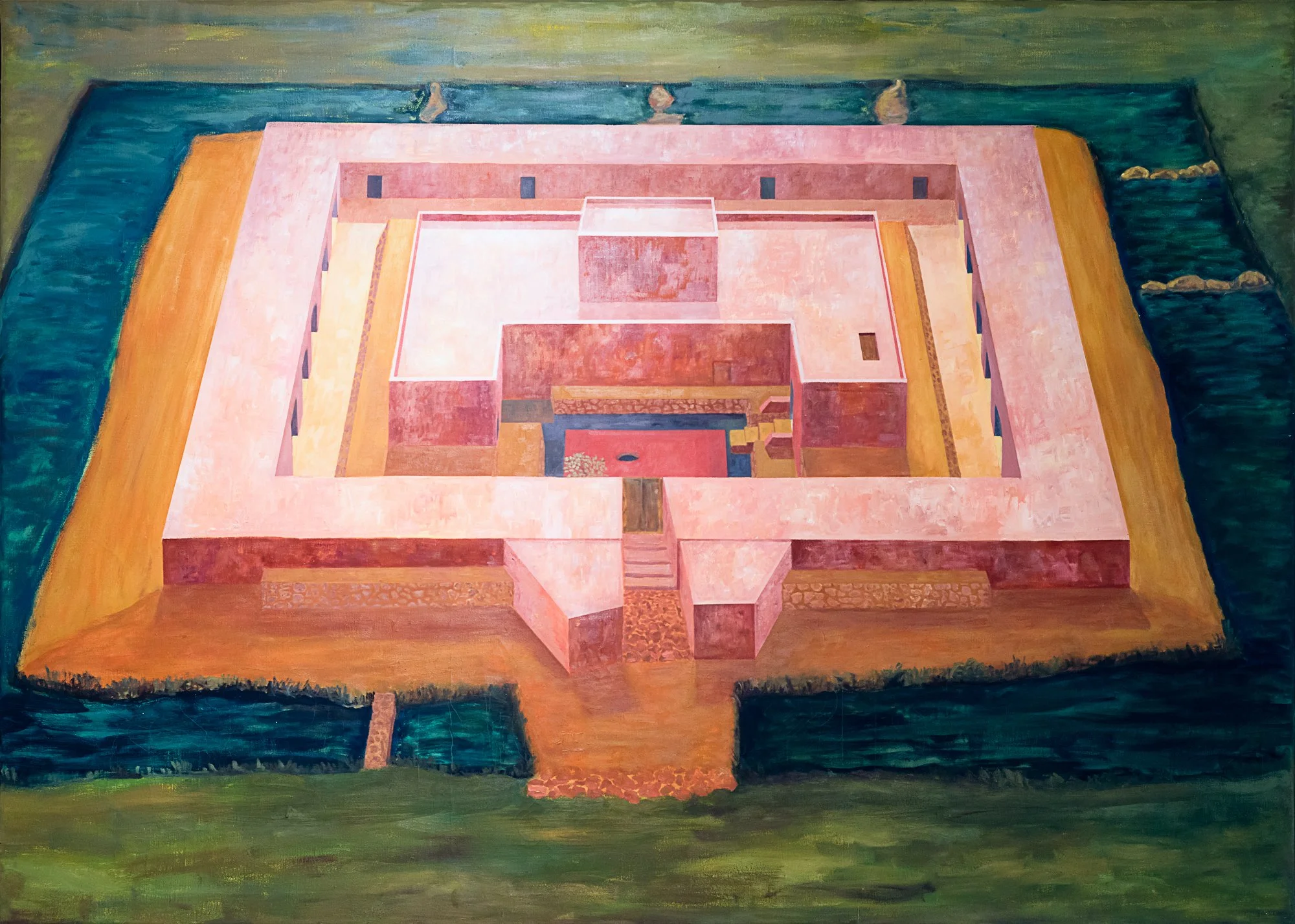 Constructed on a stone platform and surrounded by a wide moat, the complex is organized around a central courtyard. Rows of small rooms line the sides of the building. Archaeologists found storage spaces, working areas, and rooms that appear to have had ritual functions.