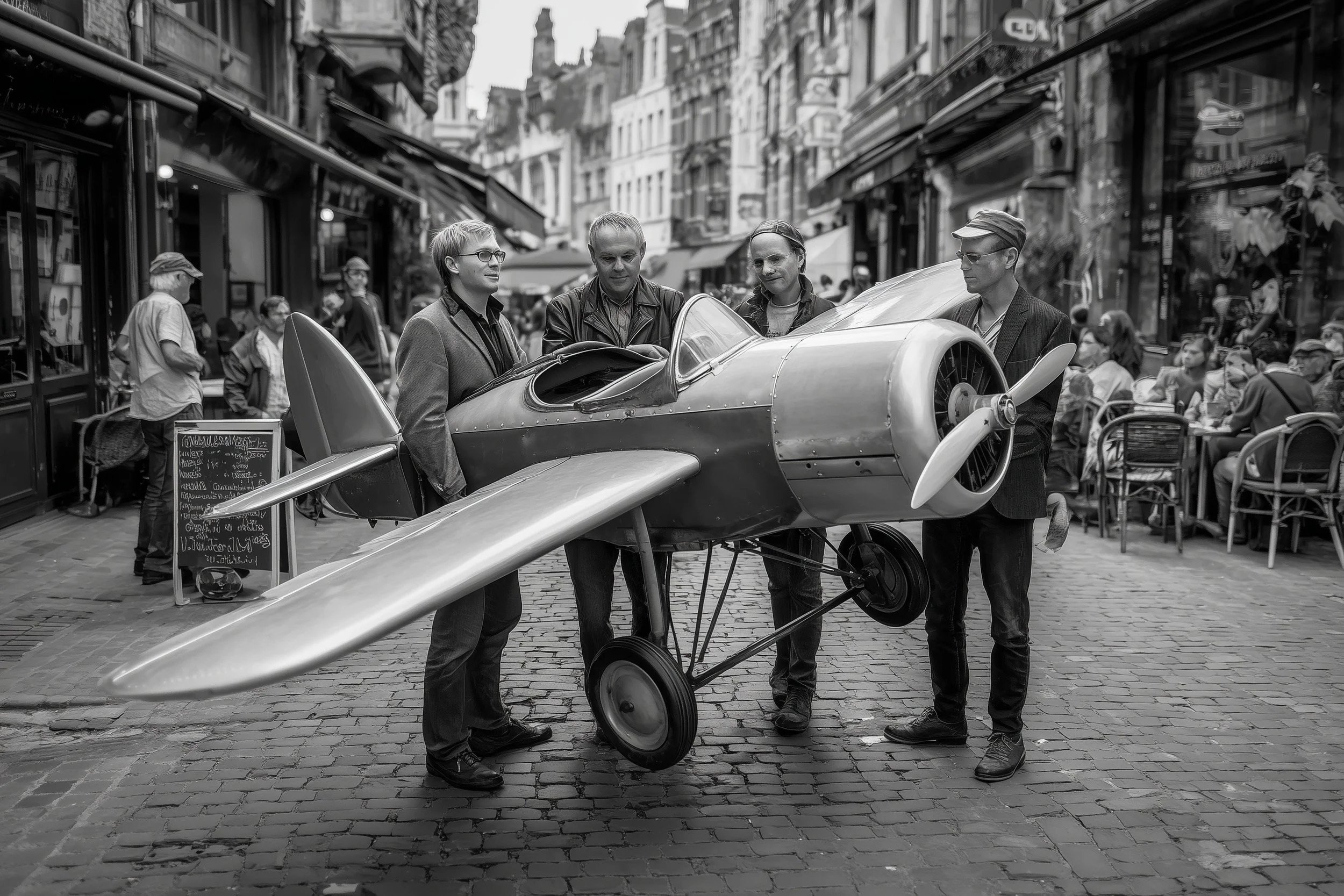 You’re walking down the street, mind elsewhere, when the back doors of a van swing open. Without ceremony, four men step into the street carrying a small airplane—not a real one, but a carousel plane, the kind children once climbed into, now lifted carefully by adult hands. No explanation, no warning. Just a fragment of a fairground drifting briefly through everyday city life.