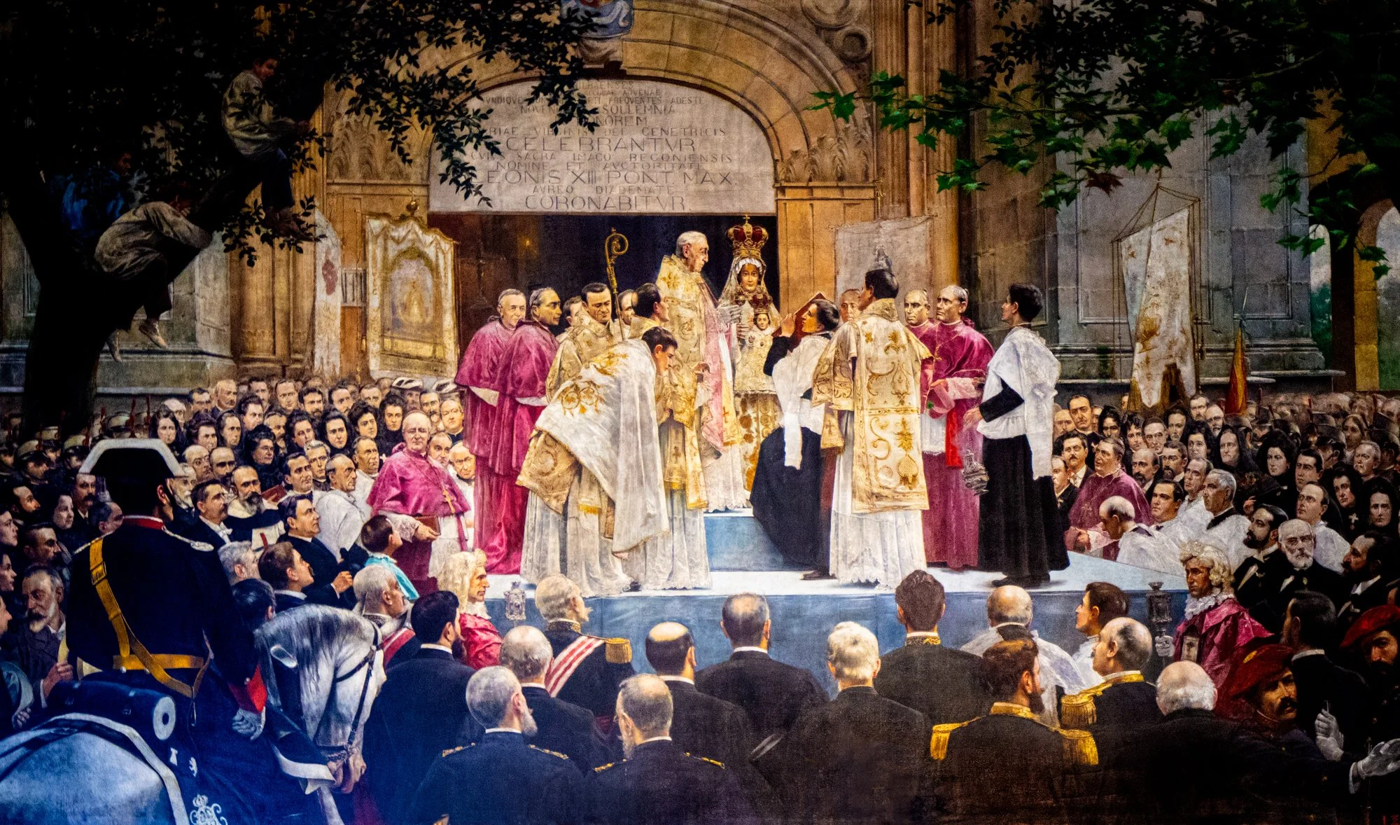 In 1902, José Etxenagusia (Echena) turned that day into a sweeping canvas for the Basilica of Begoña. He sets the scene outside the west portal: the crowned image lifted high, clergy massed around her, guards framing a dense, recognizably urban crowd. Look closer and the painting becomes a civic portrait as much as a devotional one, a who’s who of Bilbao under one crown.